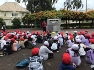 シンガポールにある「日本人墓地公園」へ清掃活動に行きました。はじめに、お花を供え、線香を手向け、シンガポールのために働き亡くなった日本人の方々を心から弔いました。その後、管理人の両頭さんから歴史についてお話をうかがい、墓に生えている雑草を抜いたり、落ち葉を拾ったりしながら、みんなで心をこめて清掃しました。活動後はとてもすがすがしい気持ちになり、命の大切さや感謝の心について考える貴重な時間となりました。