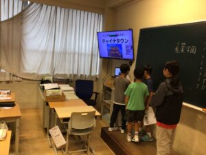 まずはオンラインを活用し、全校児童や、日本の学校へ向けても発表を行いました。自分たちが街に出て見つけたシンガポール(チャイナタウン・リトルインディア・アラブストリート)の魅力や発見を、画面越しの相手に届くよう工夫して伝える姿は、まさに小さな親善大使のようでした。また、校内では模造紙に学習の成果をぎゅっとまとめ、図書館近くのスペースに掲示しました。