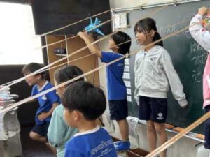 1年生が図工の学習で「スルスルビューン」の制作に取り組みました。スズランテープとクリップを組み合わせた滑る仕組みを使い、どのようなものが滑ると楽しいかを想像しながら、思い思いの作品をつくり上げました。