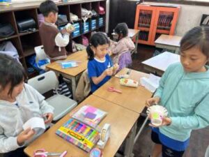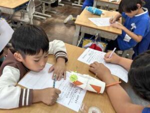 ただつくるだけでなく、実際に滑らせながら「もっと速く動かすにはどうすればいいか」「どうすれば可愛く見えるか」と試行錯誤を繰り返し、改良を重ねる姿が印象的でした。友達と一緒に滑らせる中で、新しいアイデアが生まれる場面も見られました。活動の最後には、上手く滑らせるコツや友達の作品の素敵なところを言葉にする振り返りを行いました。