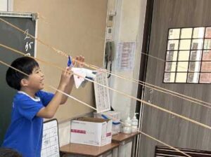 1年生が図工の学習で「スルスルビューン」の制作に取り組みました。スズランテープとクリップを組み合わせた滑る仕組みを使い、どのようなものが滑ると楽しいかを想像しながら、思い思いの作品をつくり上げました。