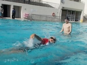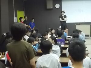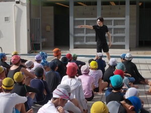 続く第二部では、プールでの実技指導が行われました。江原さんの力強くしなやかな泳ぎが披露されると、子供たちからは大きな歓声が上がりました。プロの視点から、肘の使い方や効率的なストロークのコツを直接伝授していただき、短時間で自分の泳ぎが変わる達成感を味わうことができました。最後には江原さんと子供たちの競泳も実現し、世界レベルのスピードを肌で感じる貴重な機会となりました。