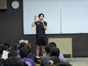 リオデジャネイロオリンピックの競泳メダリスト、江原騎士(えはら ないと)さんをお招きし、6年生を対象とした特別講座を開催しました。この時間は、トップアスリートの生き方に触れることで、自分自身の夢や目標に向き合い、困難を乗り越える資質を養うキャリア教育の一環として計画しました。