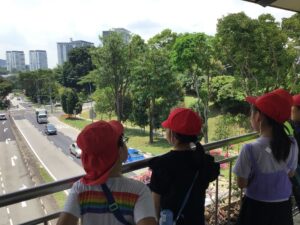 4月24,25日に3年生になって初めての社会科見学がありました。学校のまわりの様子を調べるために高いところからの見学です。クレメンティ校は屋上が使えないので学校前にある歩道橋から眺めました。普段何気なく通り過ぎる歩道橋ですが、立ち止まって見ると方角によってずいぶんと様子が違うことがわかりました。