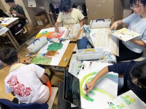 色塗りのときにも、色の重なり具合や明度からも遠近感が伝わるようにしています。完成がとても楽しみです!