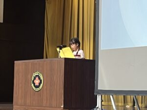 続いて、児童代表が一学期を振り返っての感想を述べました。転入してきて不安で一杯だったが、勇気を出して挨拶や声掛けをして、友達をどんどんつくっていったお話をしてくれました。多くの子供達の心に響いたものと思われます。