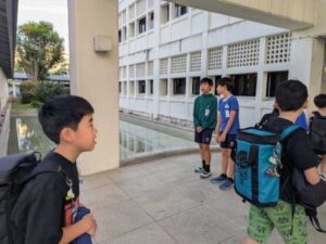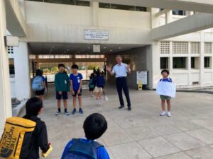 そんな中、6年生がエントランスに来て、進んで挨拶を始めました。よく見ると、昨日のお昼の放送をしていた放送委員、そして運営委員の二人でした。