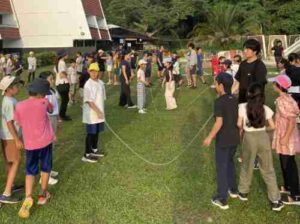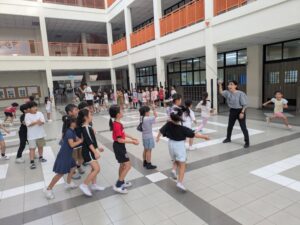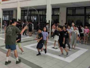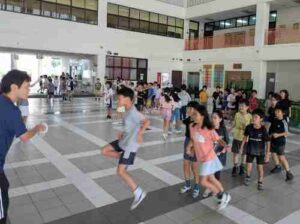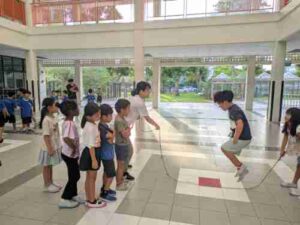 2週間ぶりの大なわ大会が「チャンギっ子タイム」に開催されました。全校での累計が「5000回」を越えることを目標とし、各クラスで練習を重ねてきました。校内放送で一斉にスタートしますが、キャンプ中の5年生も時刻を合わせ、同時に参加しました。