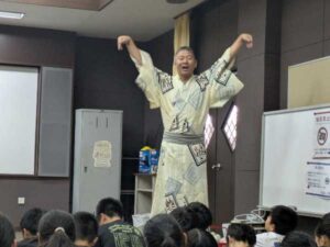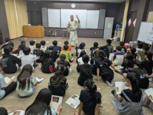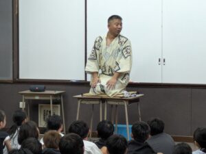 子供達が言葉のもつ表現力やおもしろさに触れ、国語への関心と理解を深めるとともに、日本文化への興味と誇りを育むことを目的とした授業を行っています。今日は、日本の伝統的な話芸である「狂言」「落語」の専門家として、元チャンギ校教員であった大平大吾先生(現東京都教員)を講師にお招きし、5・6年生が国語の教科書で取り扱っている伝統芸能に親しみました。