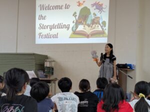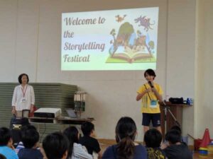一学期の英語学習のまとめとして、今回は4年生と6年生がそれぞれ一堂に会して、自分が作ったお話を代表者がみんなの前で披露しました。
