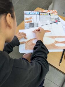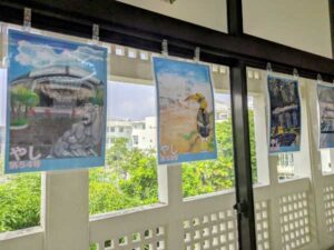 図工室に入るなり、「『やし』という文集の表紙を描いているんです」と、6年生が元気よく答えてくれました。窓際には歴代の表紙絵が吊るされており、それらに負けじと頑張っているようでした。
