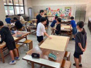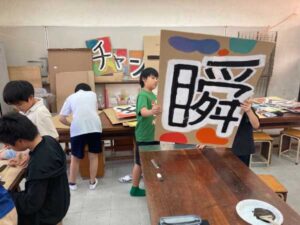 「その一歩が伝説になるチャンギっ子」を一文字一文字丁寧に段ボールに書いていました。ペンキで字をなぞるのが楽しそうでした。今後は、紅白のイメージキャラクターを全校に募集していくそうです。