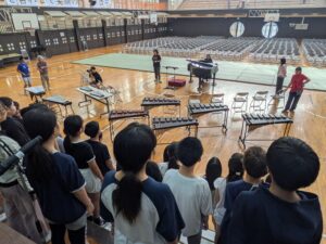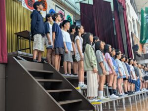 6年生の体育館練習を覗いてきました。脇にあったピアノが中央に置かれており、徹底した音の追究をしているところでした。さらに、テンポの変化も加えられ、壮大な合唱へと突き進んでいます。今日は、合奏を指導してくださっている大浦先生が日本国内の状況も知りたいと、私に声をかけてくださったので、いくつかコメントさせていただきました。