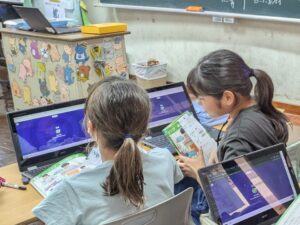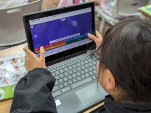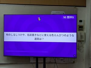 「正解」「不正解」という結果が自分のタブレットに映し出されるとともに、クラス全体の集計結果が大型テレビに表示されます。ゲーム感覚で進む学習にどの子供も夢中で取り組んでいました。楽しく学べて最高ですね。