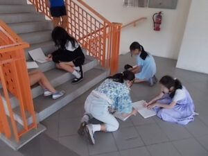 実際に巻き尺で測ってみた結果と計算で求めた結果を比べると、何と!!「8m」でした。「それなら、4階までなら12mだね」という声も上がりました。とてもよい学びを重ねています。
