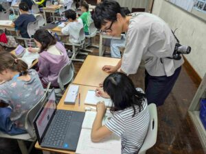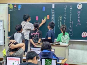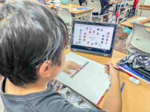 課題に真剣に取り組む中、頭を抱える子供も。そんな時、迷っている子供達を黒板の前に集め、小集団での話合いが始まりました。中には、ICTをフル活用し、参考資料を基に一人学習を進めている子供もいました。一人一人の学びに応じた授業が静かに、そして熱く展開されていました。
