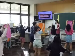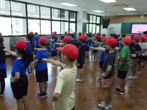 2025/09/09 チャンギ校授業の様子フラッグ を握りしめて 4年生4年生は、昨日は全体で、今日はクラスごとに練習をしていました。子供達の動きを見ていると、全体で揃える場面と、クラスごとに分かれて動く場面があるようです。 教員が作ったビデオも参考にしながらですが、カウントをしっかり取ってきびきび動けるので感心しました。フラッグがはためく姿を楽しみにお待ちください。