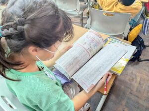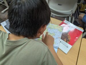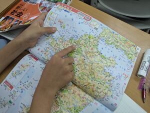不思議そうに眺めていると、「『さくひん』を使って調べているのです」とある子が教えてくれました。その子に教科書のどの部分をやっているのか尋ねると、「教科書ではなく、短い時間でたまにやっています」と笑いながら答えてくれました。これを毎回続けていたら、地図を読む力がしっかり身に付くと思いました。素晴らしい取組です。