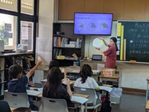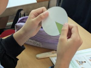 4年生は、算数で「角の大きさ」についての学習を始めました。今日は、円に切れ目を入れた画用紙を組み合わせて、自分で操作してみることで、様々な角を作ってみていました。