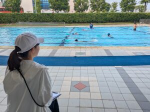 低学年プールでは、イマージョン水泳のコーチと3年担任との間で、一人一人の上達ぶりについて確認し合っていました。「何秒で25メートルを泳ぎ切ることができるのか」「重点的に学習した息継ぎはどうであるか」など、先週からのテストも踏まえて丁寧に見とっていました。