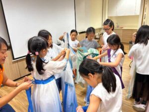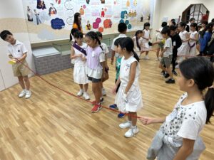 今は、民族衣装を着せてもらったり、一緒にゲームをしたりして、大いに楽しんでいるところです。初めての体験に、子供達はドキドキワクワクです。