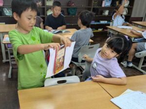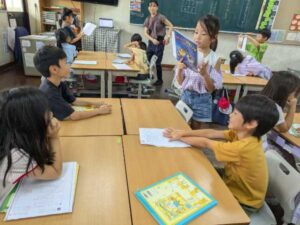 題名や筆者、登場人物に本の概要、そしておもしろいところや好きなところを発表することになっています。話し方や聞き方の指導もきちんとされており、子供達は笑顔で学習に臨んでいました。