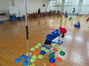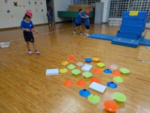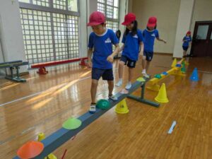 友達と一緒に遊び方を工夫し、考えた運動遊びを友達に伝えるとともに、体つくりの運動遊びに進んで取り組み、きまりを守り誰とでも仲よく運動遊びをしたり、場の安全に気を付けたりする姿をこれからも目指していきます。