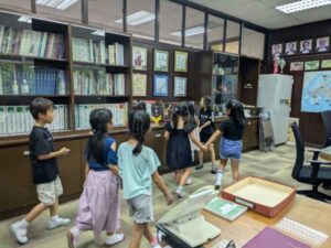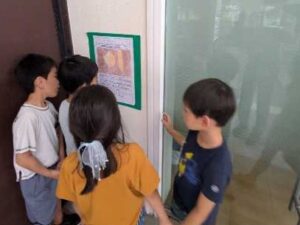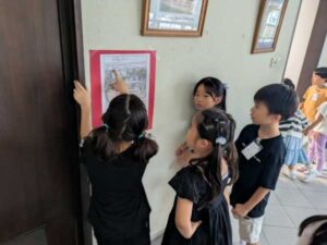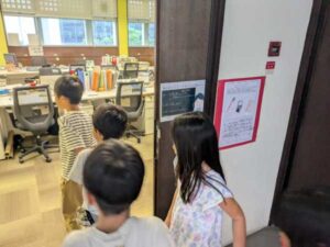 主な部屋の前には、2年生が作った案内文が掲示されており、グループごとに読み上げては、部屋の様子を興味深く覗いていました。学校のことがよく分かるようになるとともに、1年生と2年生という縦のつながりも深まったようです。