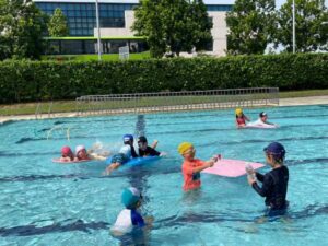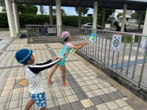 2025/07/18 チャンギ校授業の様子水をビュー! 1年生1年生の生活の授業で、「水遊び」をしました。おうちから持ってきた容器を使って、的に向かって水をビュー! プールでも、友達と楽しくぷかぷか浮かびました。とても楽しい時間になったようです。