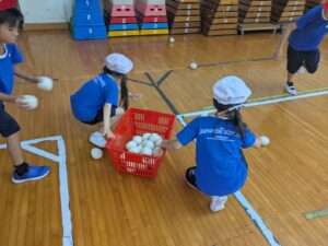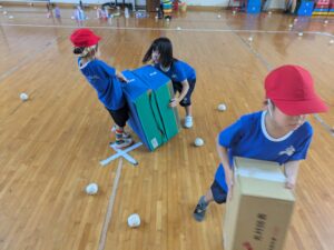 そんな中、「みんなで片付けましょう」と板垣先生が声をかけると、子供達は一斉に動き出しました。友達と協力してボールを拾ったり、台や段ボールを運んだりと一生懸命に働いています。自分達で使う物を自分達で片付けることは、次回への準備につながります。1年生の主体的な姿が見られて嬉しくなりました。