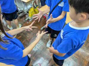 「あわせていくつ♬やってみよ♬」と言った後、両手の指を立てたり折ったりしています。そして一人が「14」と元気よく答えていました。なるほど、立てている指の数を足した数を言っていることが分かりました。遊びながら学べる「たしざんじゃんけん」。算数の時間がより楽しくなりますね。