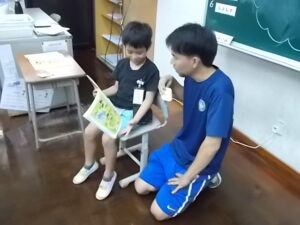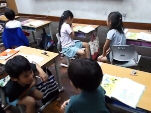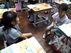 その後は、教科書の手本を見ながら教室を歩き回り、いろいろな友達に質問したり、聞かれたことに答えたりしていました。日頃から使えるようになるといいですね。