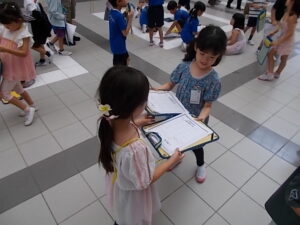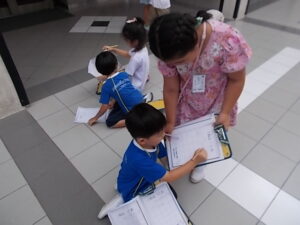 2025/05/27 チャンギ校授業の様子サインを集めてハッピー 1年生低学年のフロアーで、1年生が入り乱れて活動していました。近づいてみると、自己紹介をした後、友達のカードに自分のサインをしてあげていました。 仲間づくりには打ってつけの取組みですね。