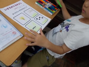 1年生の生活科で校内で見つけた生き物を絵に表していました。チョウやトンボの他に、カマキリやアリの絵を描いている子供がいました。