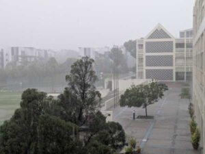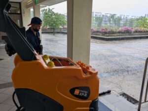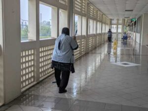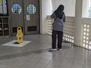 突然の土砂降りの雨。暑さは和らぐとはいえ、風が吹くと校舎内にもたくさんの雨が吹き込んできます。心配になり、フロアの様子を見に行くと、そこには黙々と働いてくださっているクリーナーの皆さんの姿がありました。