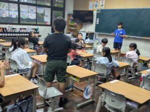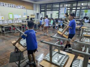 毎週金曜日のチャンギタイムは「縦割り班清掃」です。3回目となると、役割も明確化され、取り掛かりも早くなってきています。ただ、重い机や椅子を運ぶのにはとても苦労している様子でした。