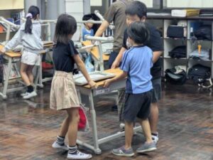 しばらく様子を見ていると、高学年が低学年に対して「こうやるといいよ」と声をかけながら自らやって見せています。また、二人で運んでいるところに三人目が手を貸している場面も見られました。