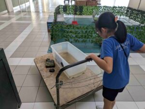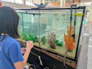 2025/04/28 チャンギ校お世話 頑張っています登校後、すぐにホールにある水槽に向かい、テキパキと動き回る集団を見付けました。飼育委員会の皆さんです。水替えをしたり、水質を測ったりと、笑顔で作業を進めており、何とも頼もしい限りです。 人ばかりではなく、生き物とかかわることで育まれる思いやりの気持ちもあります。これからもよろしくお願いします。