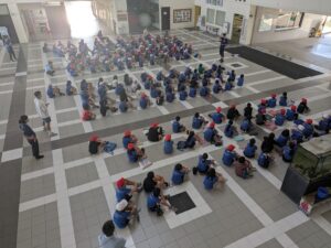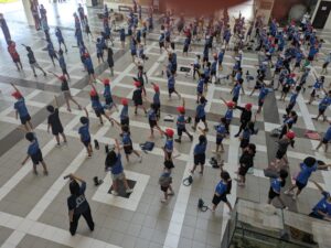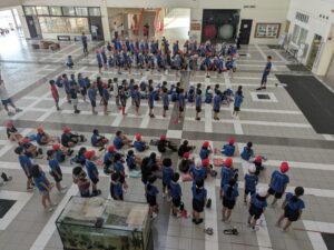 朝、中学年がエントランスホールに集まっていました。何が始まるのかと、2階から様子をしばらく見守っていると、「運動会まで後数日であり、練習時間も限られていることからも、みんなの気持ちを合わせることが大切である」と藤原先生が力説していました。