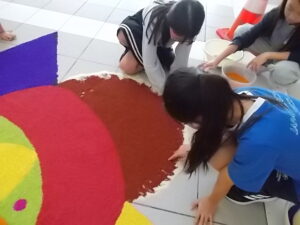 本校では、国際広報委員会が数日間かけて完成させました。私も最終日に少しだけやらせてもらいました。隣で熱心に取り組んでいる子供に聞くと、「いろいろな色が付いた米をどのように置いていけばよいのか考えるのが楽しい」というコメントが返ってきました。