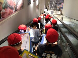 10月9日午前中、スーパーマーケットの明治屋さんに社会科見学にいきました。自分の家の近くのお店にはよく行きますが、あらためてスーパーマーケットの工夫を注意深く観察しました。お客さんが買い求め易いように、同じ種類のものが並んでいたり、小さな看板がかかっていたり、重いものを運んでもらったり…。商品を保存するための冷蔵庫や冷凍庫に入れさせてもらったのですが、その寒さにびっくり。まさに体の芯から冷え切ってしまうほどでした。お店で働く人はたくさんの人に買ってもらうために、いろいろな工夫をしているのだなということがよくわかりました。