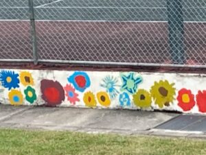 まずは、低学年がテニスコート横の壁面に「笑顔になりそうな花」を描いています。ご来校の際は、かわいらしい花をご覧いただき、笑顔になっていただけたらと思います。