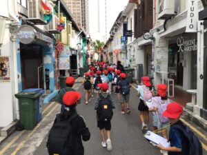 探究科学習の一環として、この活動は12月に予定されている「シンガポールクエスト」のための「事前下見」として位置づけられています。子どもたちは、多文化社会シンガポールの多様性を肌で感じることを目的としました。