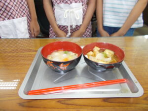 ノックの後、「失礼します」とエプロン姿の5年生が校長室に入ってきました。手元を見ると、お盆の上にお味噌汁が乗っています。「家庭科の授業で作ったので、食べてみてください。」とのこと。本当にいただいてよいのか聞き返すと、「たくさん作って余ったので!」との返答。。遠慮なくいただくことにしました。