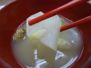 2種類のお味噌汁ですが、主となる具材がナスとダイコンで異なっています。厚切りなので固くないか心配ではありましたが、口にすると野菜そのものの味が際立つやわらかさで、とてもおいしくいただくことができました。ご馳走様です。100点です!!