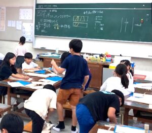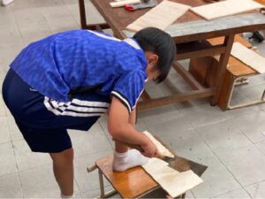 2025/11/03 チャンギ校ギコギコトントンクリエイター 4年生今年も図工室からのこぎりを挽く音が聞こえてきました。現在4年生が、木材を使った作品作りに挑戦中です。子供たちは、足で板を押さえて上手に切っていました。どんな作品が完成するのでしょう?お楽しみに…。