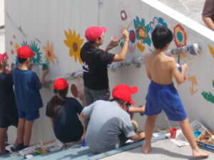 晴天の下、今日は5年生がプロジェクトに取り組んでいます。エントランスからグラウンドに抜けていく階段部分なので、斜めの壁にイラストを描くのは少々大変な様子でした。