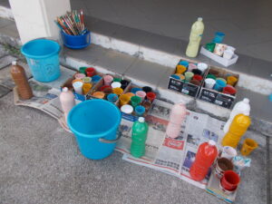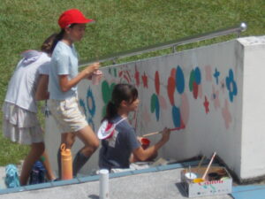 晴天の下、今日は5年生がプロジェクトに取り組んでいます。エントランスからグラウンドに抜けていく階段部分なので、斜めの壁にイラストを描くのは少々大変な様子でした。