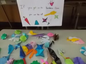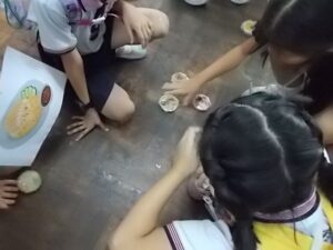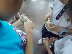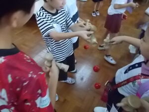 その後、クラスごとにチャンギ校が用意した五つの店(めんこ、だるまおとし、こま、けん玉、魚つり)を回りました。チャンギ校の児童は、お店を一緒に回る組とお店番に半分ずつ分かれ、友達を温かく丁寧にもてなしていました。