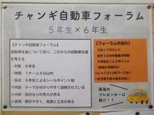 5年生が取り組んだ「チャンギ自動車フォーラム」に、6年生が聴衆・審査員として参加しました。このフォーラムは、5年生が自動車生産について深く調べ、「これからの自動車生産」について考えをまとめるという、非常にアカデミックな取組みです。